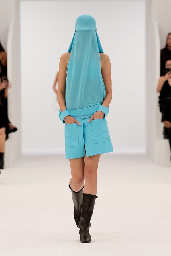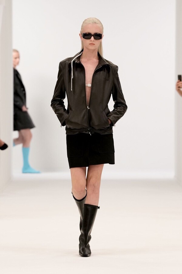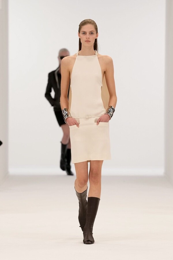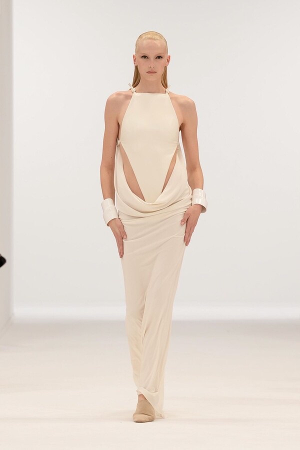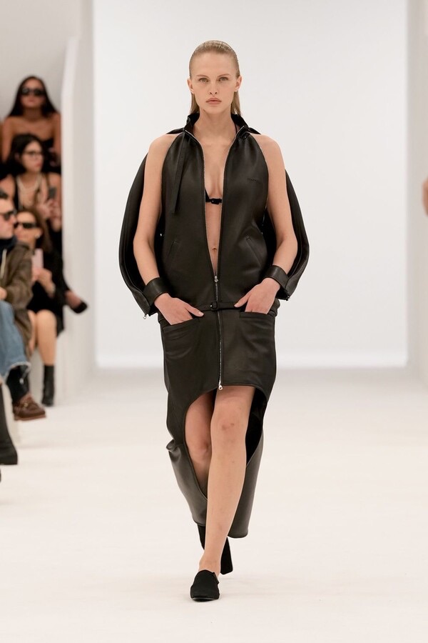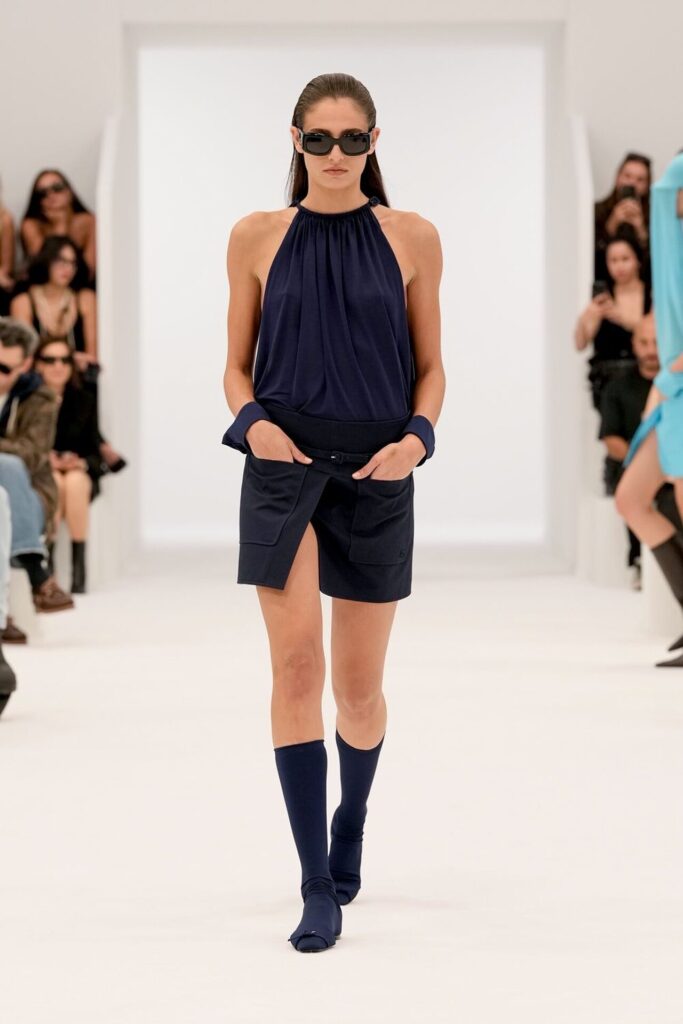 Dès les premières notes de basse, les sièges vibrent. Le sol pulse. Les corps s’éveillent. Et sur le podium, les silhouettes glissent comme des mirages. Les robes se fondent sur la peau, les tissus épousent les visages, les couleurs oscillent entre turquoise et bleu nuit. C’est sensuel, mais jamais lascif. Minimal, mais jamais froid. Le créateur joue avec la dissolution. Il efface les contours, brouille les repères. Les bottes hautes et les mini-robes rappellent les années 60, mais les superpositions de cuir et les transparences brutales projettent Courrèges dans un futur organique. Un futur où le vêtement ne couvre pas, il révèle. Il transforme.
