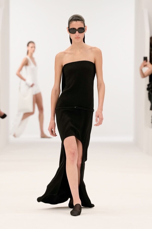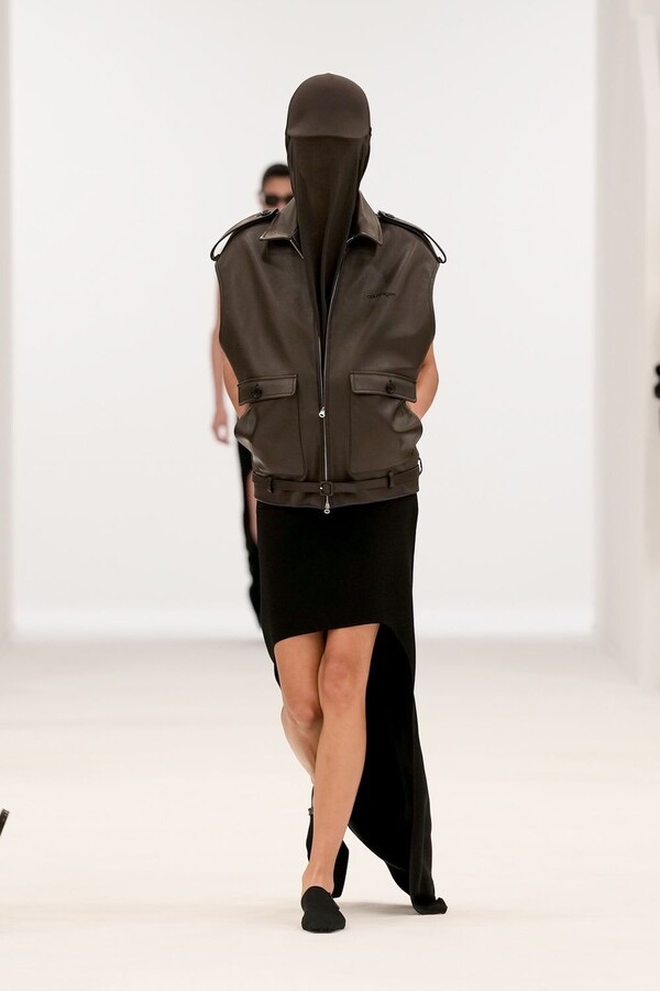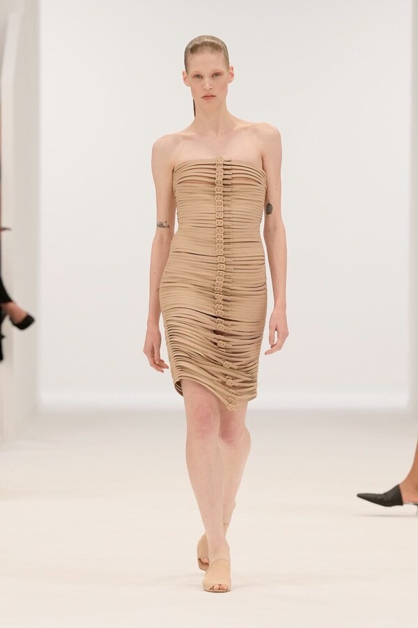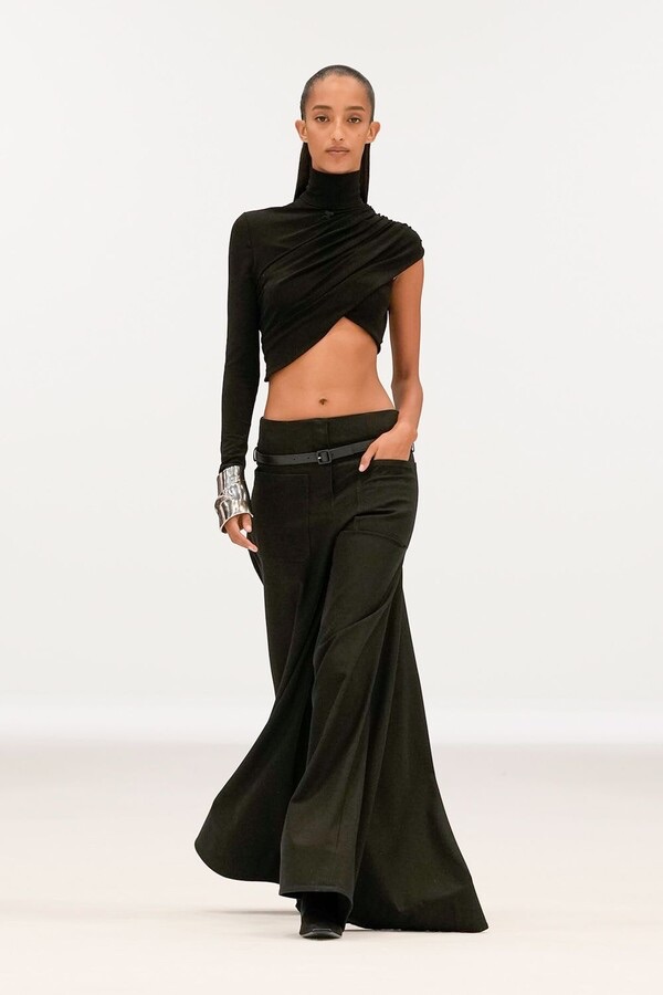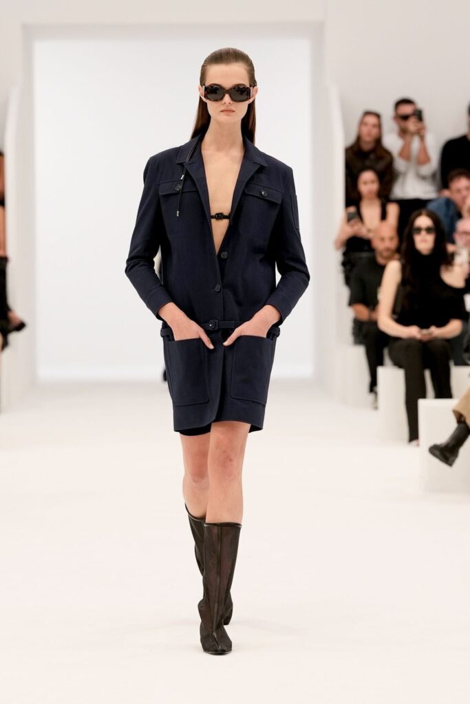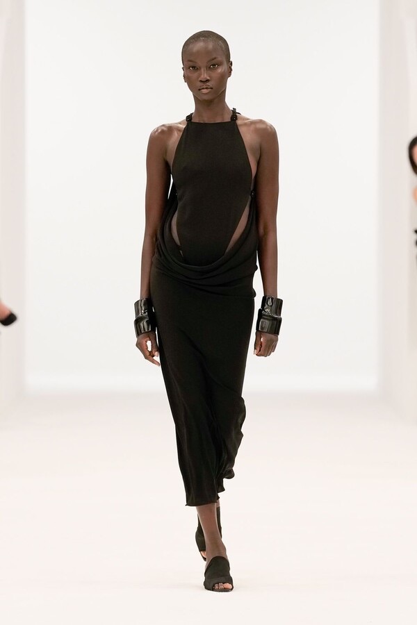 Dès les premières notes de basse, les sièges vibrent. Le sol pulse. Les corps s’éveillent. Et sur le podium, les silhouettes glissent comme des mirages. Les robes se fondent sur la peau, les tissus épousent les visages, les couleurs oscillent entre turquoise et bleu nuit. C’est sensuel, mais jamais lascif. Minimal, mais jamais froid. Le créateur joue avec la dissolution. Il efface les contours, brouille les repères. Les bottes hautes et les mini-robes rappellent les années 60, mais les superpositions de cuir et les transparences brutales projettent Courrèges dans un futur organique. Un futur où le vêtement ne couvre pas, il révèle. Il transforme.