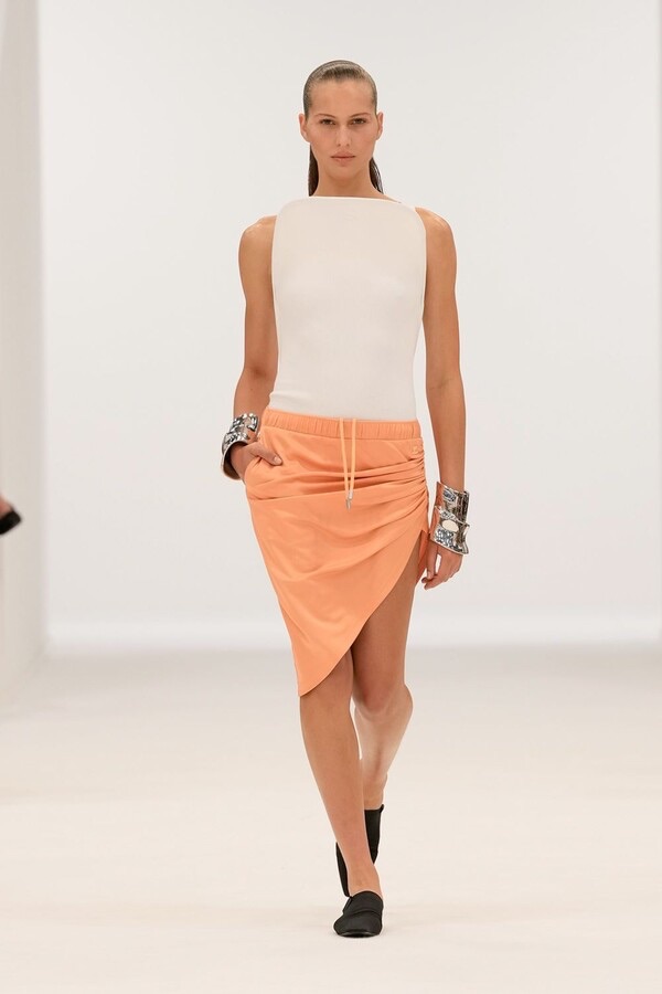 Et puis elle arrive. Seize ans, démarche assurée, regard franc. Kai Schreiber, fille de Naomi Watts, incarne ce passage de relais que Nicolas Di Felice maîtrise à la perfection. Elle ne joue pas à la muse. Elle est le signal. Celui d’une mode qui ne se fige pas, qui circule, qui respire. Une mode intergénérationnelle, fluide, affranchie. Chez Courrèges, le corps n’est pas un support. Il est le sujet. Chaque silhouette est pensée comme une extension de l’énergie intérieure. La sueur devient matière, la chaleur devient langage. On ne regarde pas les vêtements. On les ressent.