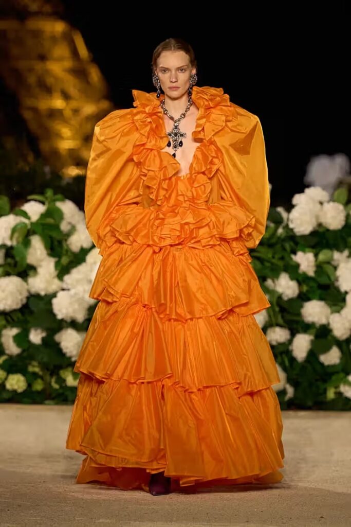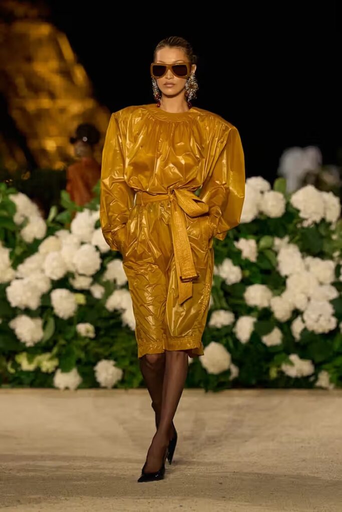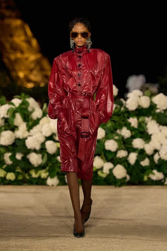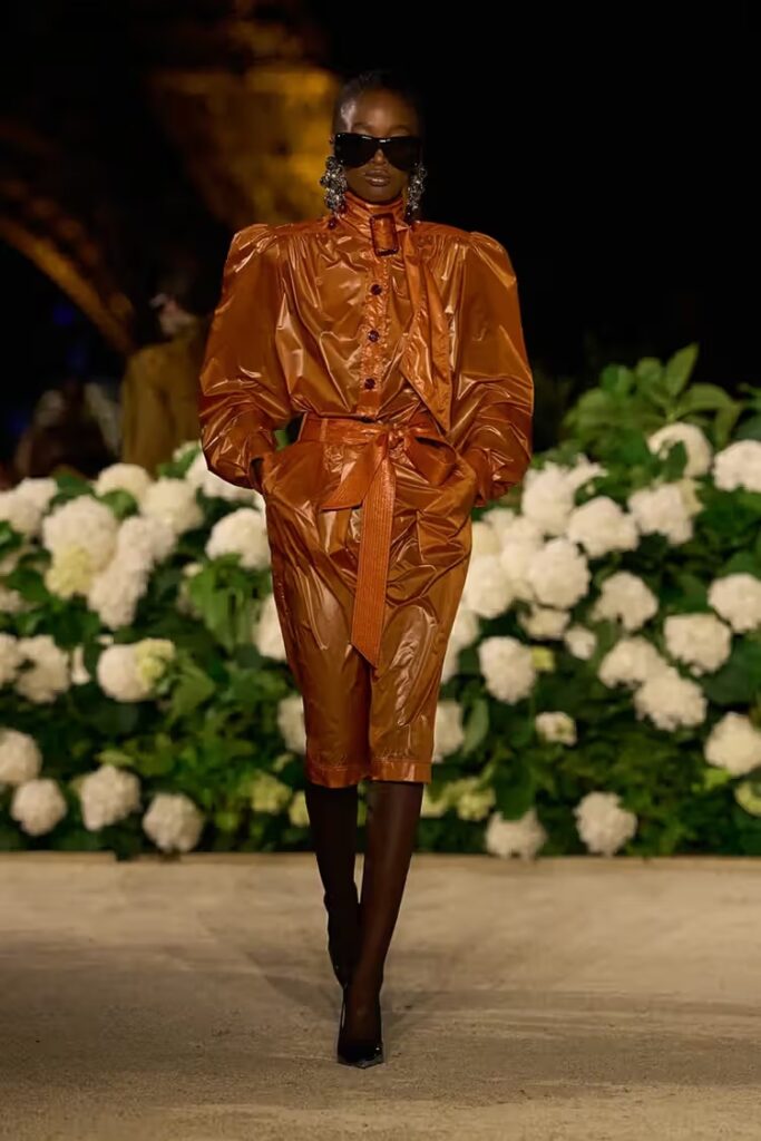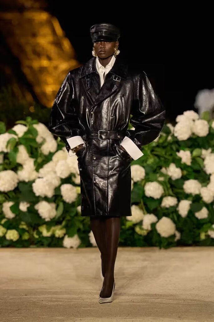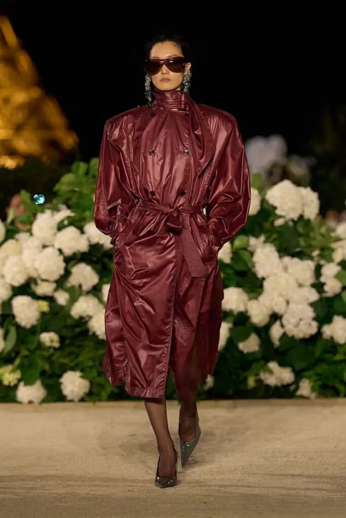 Il y a chez Anthony Vaccarello une obsession délicieuse pour les figures féminines qui dérangent. Pas les muses dociles, mais celles qui s’échappent. Ce soir-là, il convoquait la Belle de jour de Buñuel, Catherine Deneuve en bourgeoise insatisfaite, mais aussi la parisienne mythique – celle qu’on ne définit jamais vraiment, parce qu’elle glisse entre les doigts. Une femme qui ne séduit pas, elle fascine. Et qui, surtout, ne demande jamais la permission. Les silhouettes se succèdent comme des métamorphoses. Tantôt cuir noir et carrure 80’s, tantôt trenchs parachutes aux couleurs vives, tantôt robes de princesses aux volumes dramatiques. Chaque passage est une facette, une humeur, une prise de position. le styliste belge ne raconte pas une histoire linéaire. Il compose un kaléidoscope.