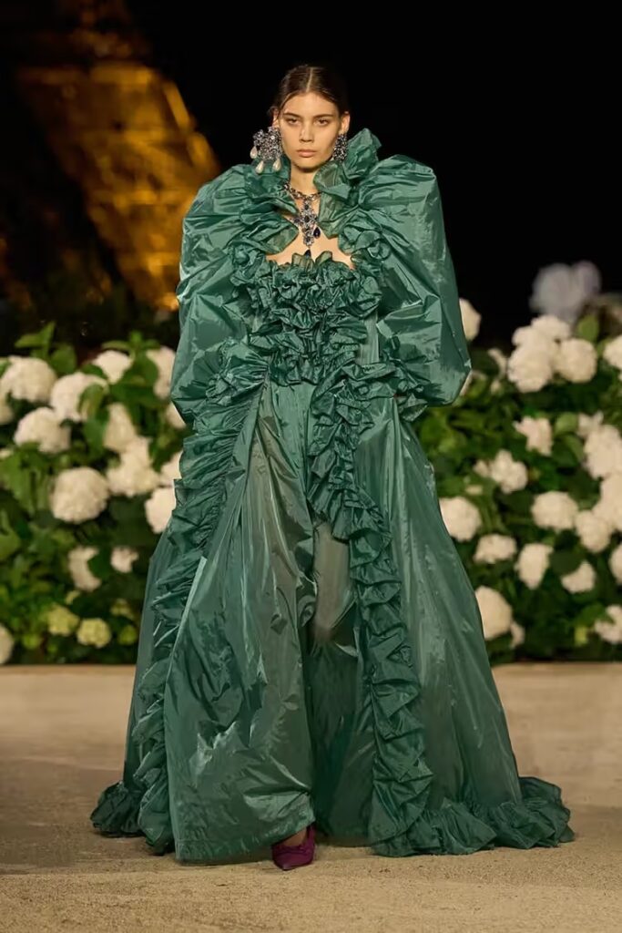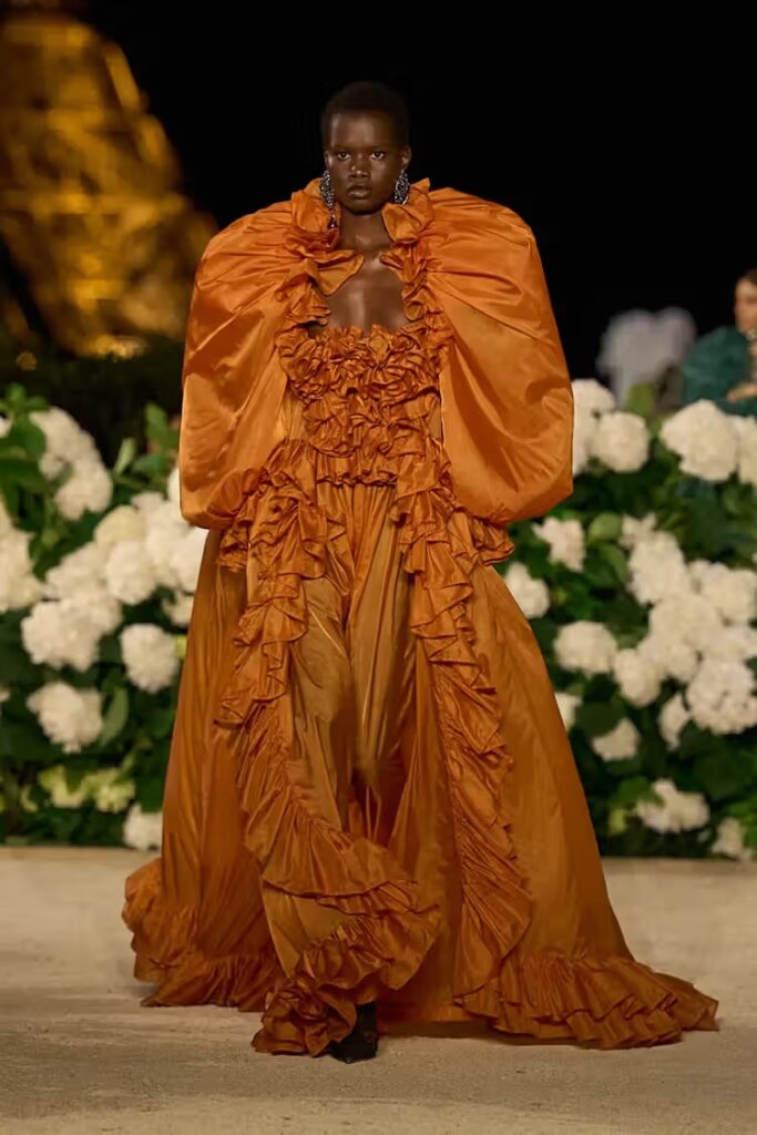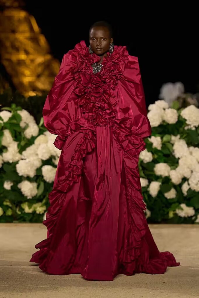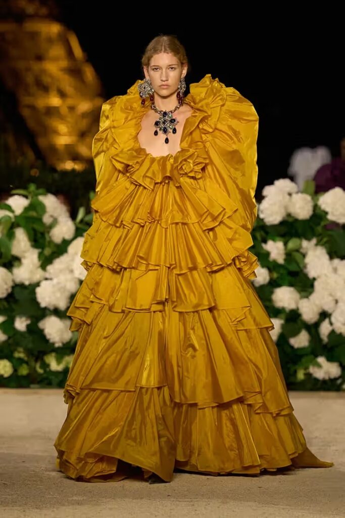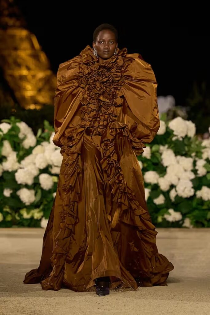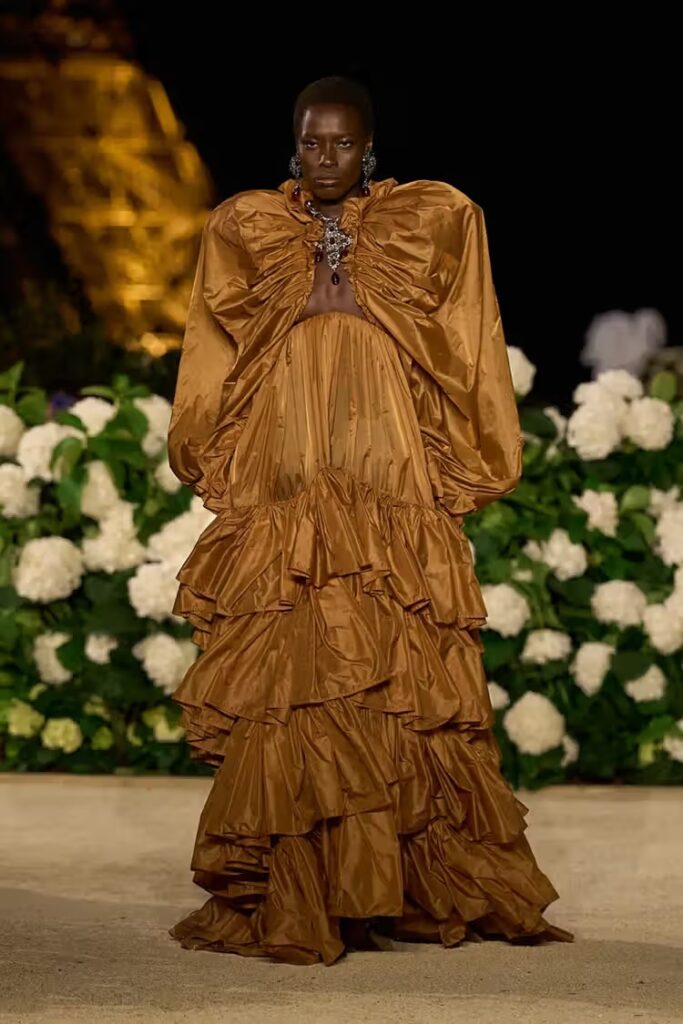 Il y a chez Anthony Vaccarello une obsession délicieuse pour les figures féminines qui dérangent. Pas les muses dociles, mais celles qui s’échappent. Ce soir-là, il convoquait la Belle de jour de Buñuel, Catherine Deneuve en bourgeoise insatisfaite, mais aussi la parisienne mythique – celle qu’on ne définit jamais vraiment, parce qu’elle glisse entre les doigts. Une femme qui ne séduit pas, elle fascine. Et qui, surtout, ne demande jamais la permission. Les silhouettes se succèdent comme des métamorphoses. Tantôt cuir noir et carrure 80’s, tantôt trenchs parachutes aux couleurs vives, tantôt robes de princesses aux volumes dramatiques. Chaque passage est une facette, une humeur, une prise de position. le styliste belge ne raconte pas une histoire linéaire. Il compose un kaléidoscope.