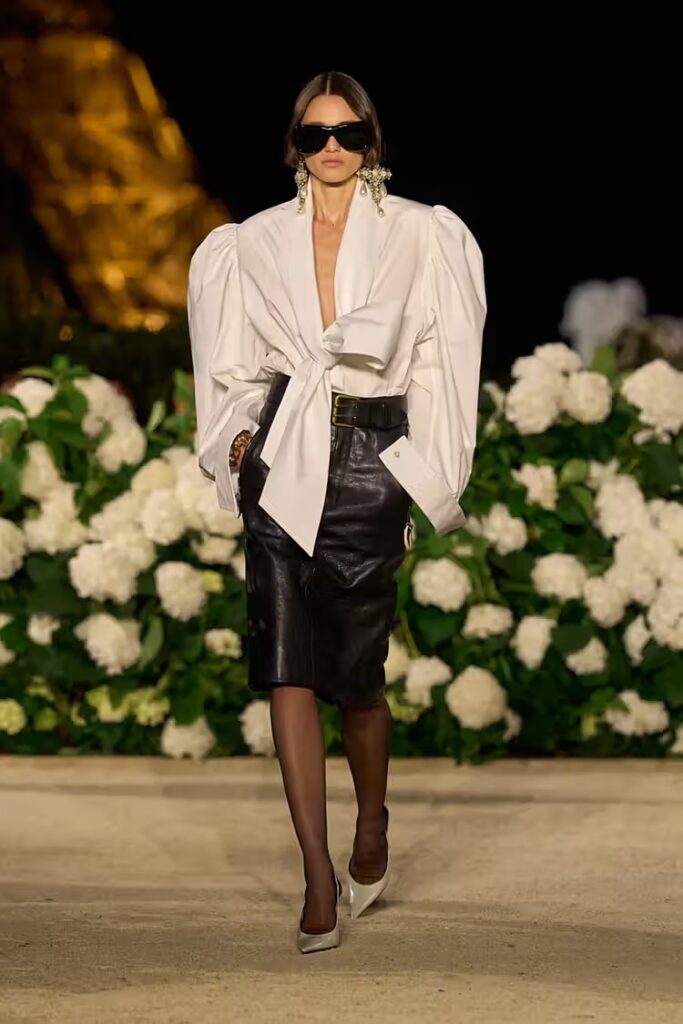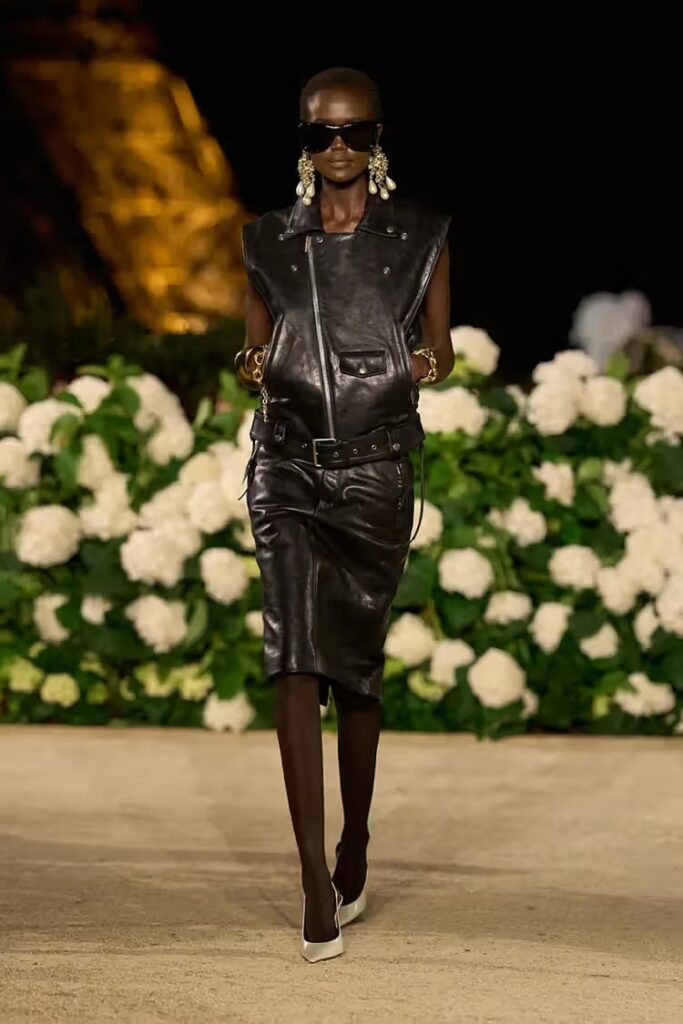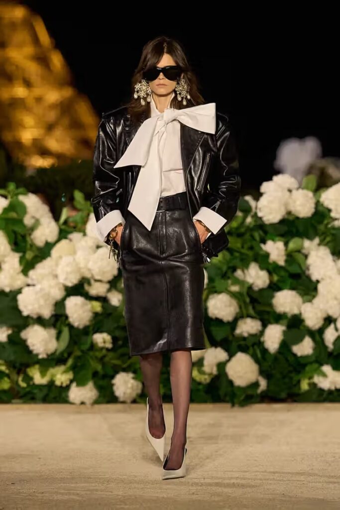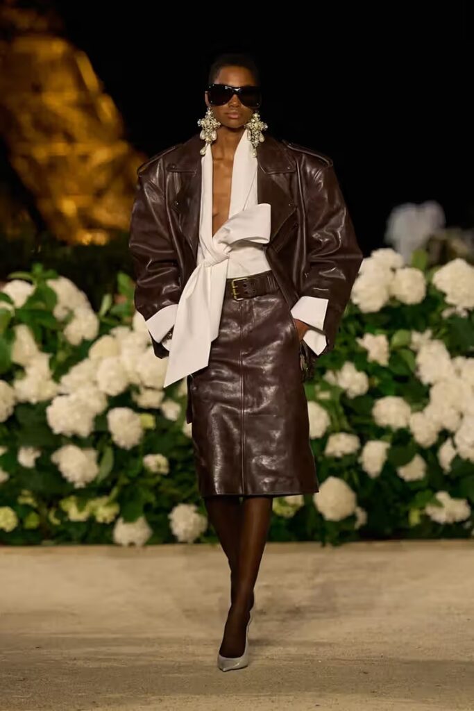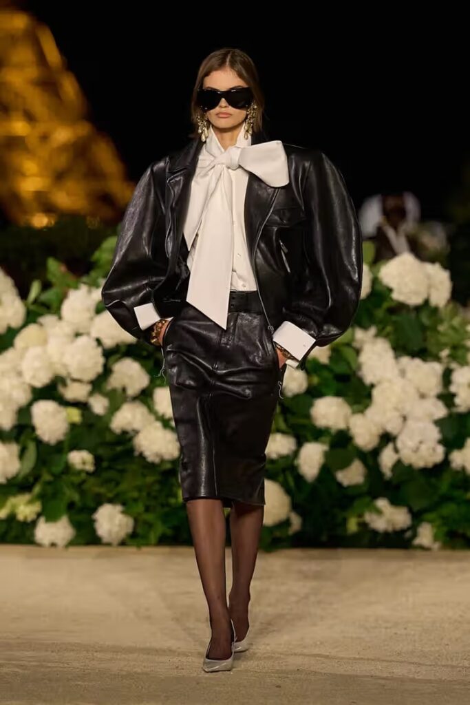 Le défilé s’ouvre sur des femmes en cuir, armures modernes aux détails BDSM à peine suggérés. Robert Mapplethorpe plane, comme une ombre sensuelle et provocante. Puis viennent les silhouettes « Rive Gauche », légères, colorées, presque insouciantes. Un souffle de liberté dans un monde où la tradwife refait surface. Enfin, les robes de duchesses, de reines, de héroïnes. Marie-Antoinette version Coppola, Madame X, la duchesse de Guermantes , toutes réinventées pour courir, pour vivre, pour exister. Anthony Vaccarello ne cherche pas à plaire. Il cherche à dire. Et ce qu’il dit, c’est que la mode peut être politique. Que chaque vêtement peut être un manifeste. Que chaque silhouette peut être un acte de résistance.