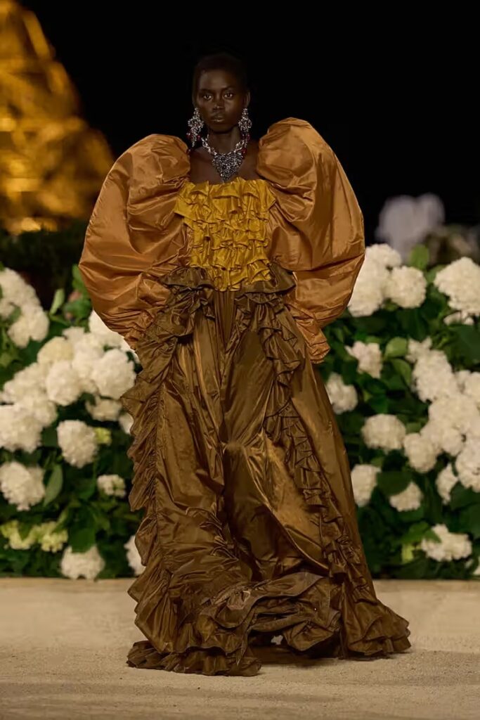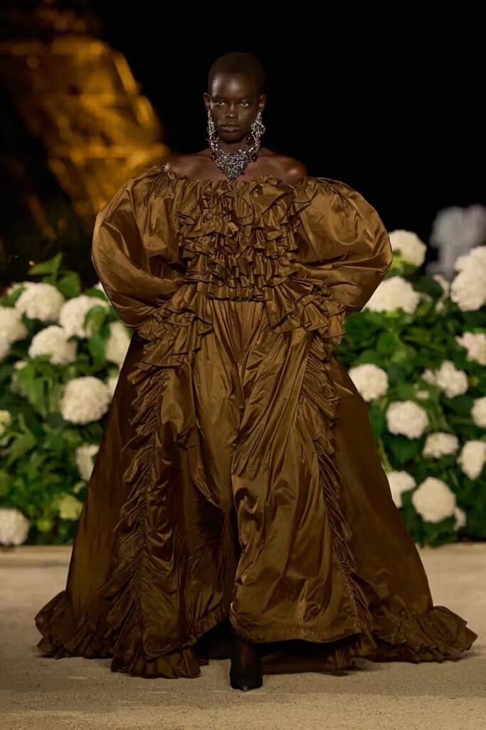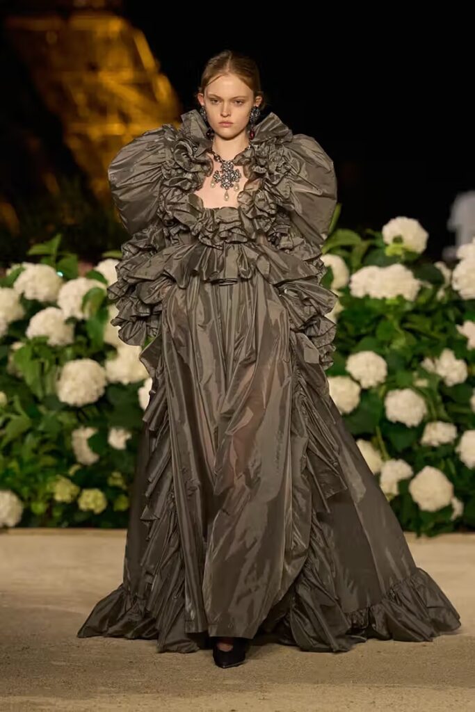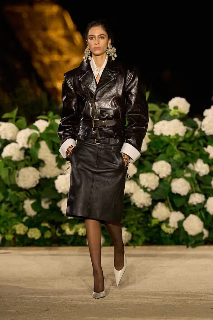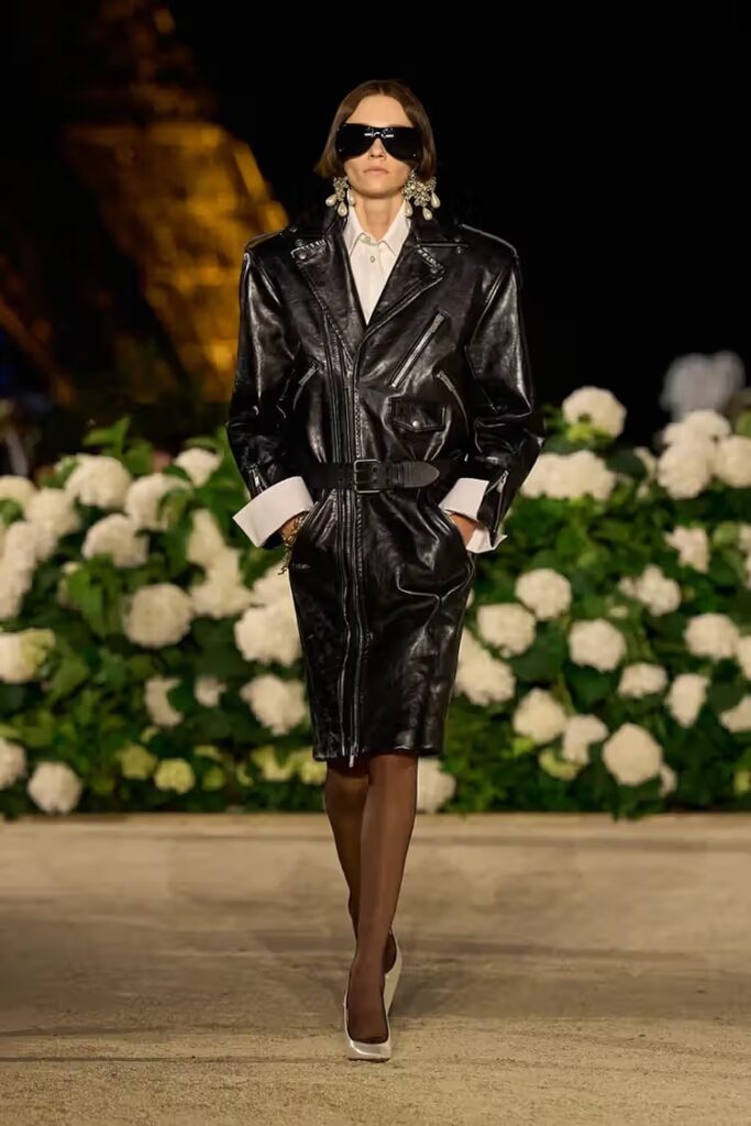 Le défilé s’ouvre sur des femmes en cuir, armures modernes aux détails BDSM à peine suggérés. Robert Mapplethorpe plane, comme une ombre sensuelle et provocante. Puis viennent les silhouettes « Rive Gauche », légères, colorées, presque insouciantes. Un souffle de liberté dans un monde où la tradwife refait surface. Enfin, les robes de duchesses, de reines, de héroïnes. Marie-Antoinette version Coppola, Madame X, la duchesse de Guermantes , toutes réinventées pour courir, pour vivre, pour exister. Anthony Vaccarello ne cherche pas à plaire. Il cherche à dire. Et ce qu’il dit, c’est que la mode peut être politique. Que chaque vêtement peut être un manifeste. Que chaque silhouette peut être un acte de résistance.