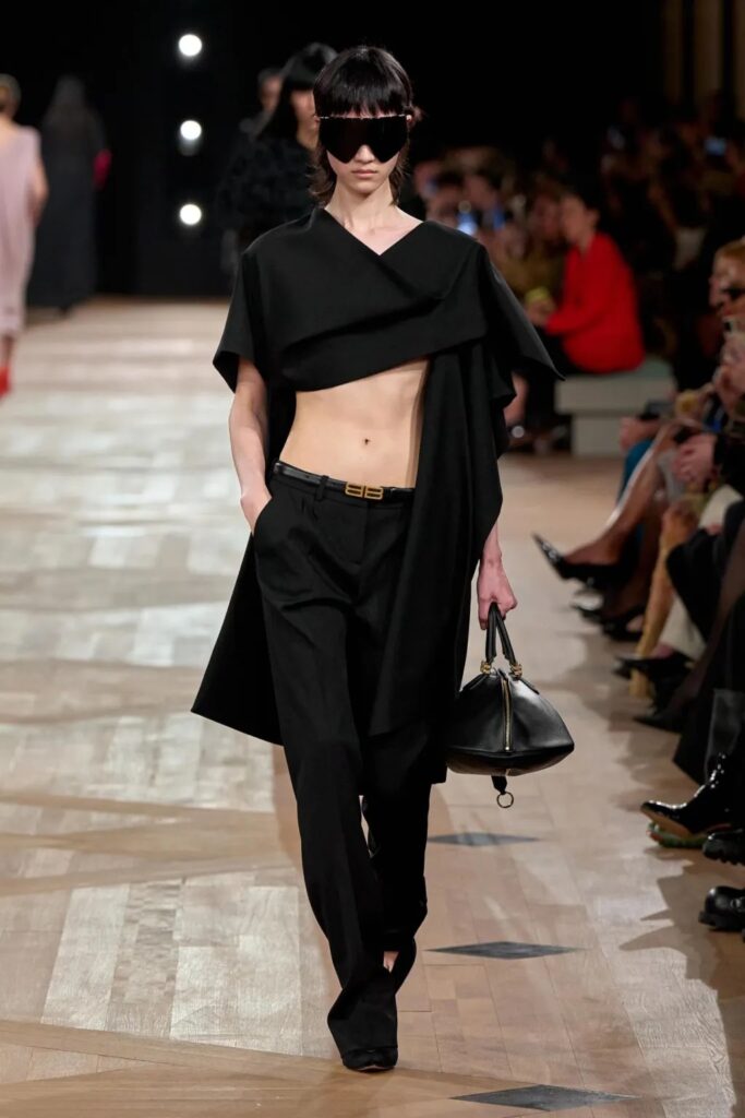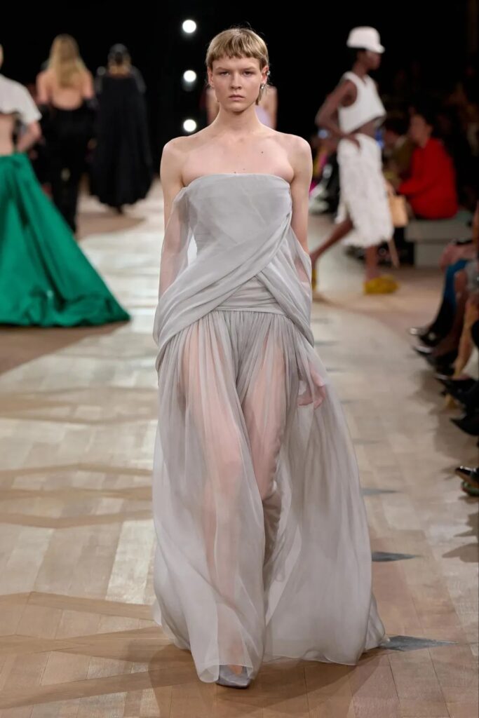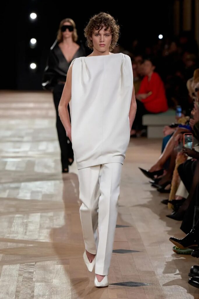 « Je voulais offrir de l’espace au corps », confie le maître en coulisses. Et sur le podium, cette idée prend forme. Robes drapées, blousons boule, chemises amples, chaque pièce semble flotter, respirer, dialoguer avec le vide. Le gazar, matière fétiche de Balenciaga, est revisité. Non pas ressuscité, mais réinterprété. Pierpaolo Piccioli en extrait les principes, les transpose dans ses propres étoffes. La collection est rigoureuse, mais jamais rigide. Elle parle d’architecture, mais aussi de souffle. Elle enveloppe sans enfermer. Elle protège sans masquer.