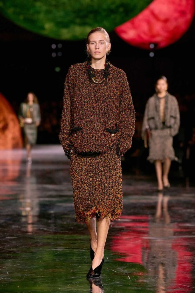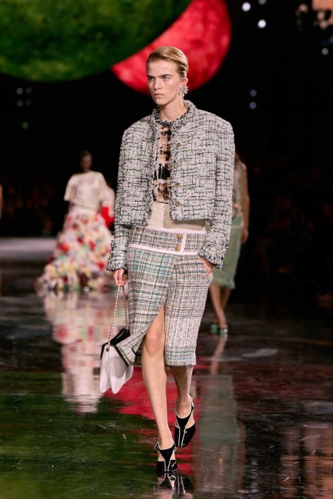 Ce printemps-été 2026, Blazy ne parle pas d’une femme Chanel. Il évoque les femmes Chanel Celles qui rêvent, qui marchent, qui flottent. Le défilé s’ouvre sur une réinvention du tailleur en tweed : le cardigan devient tailleur-pantalon, les revers se relèvent, le pantalon s’élargit et descend sur les hanches. Le mouvement est fluide, presque aérien. Les vêtements semblent portés par le vent, comme des pensées en suspension.