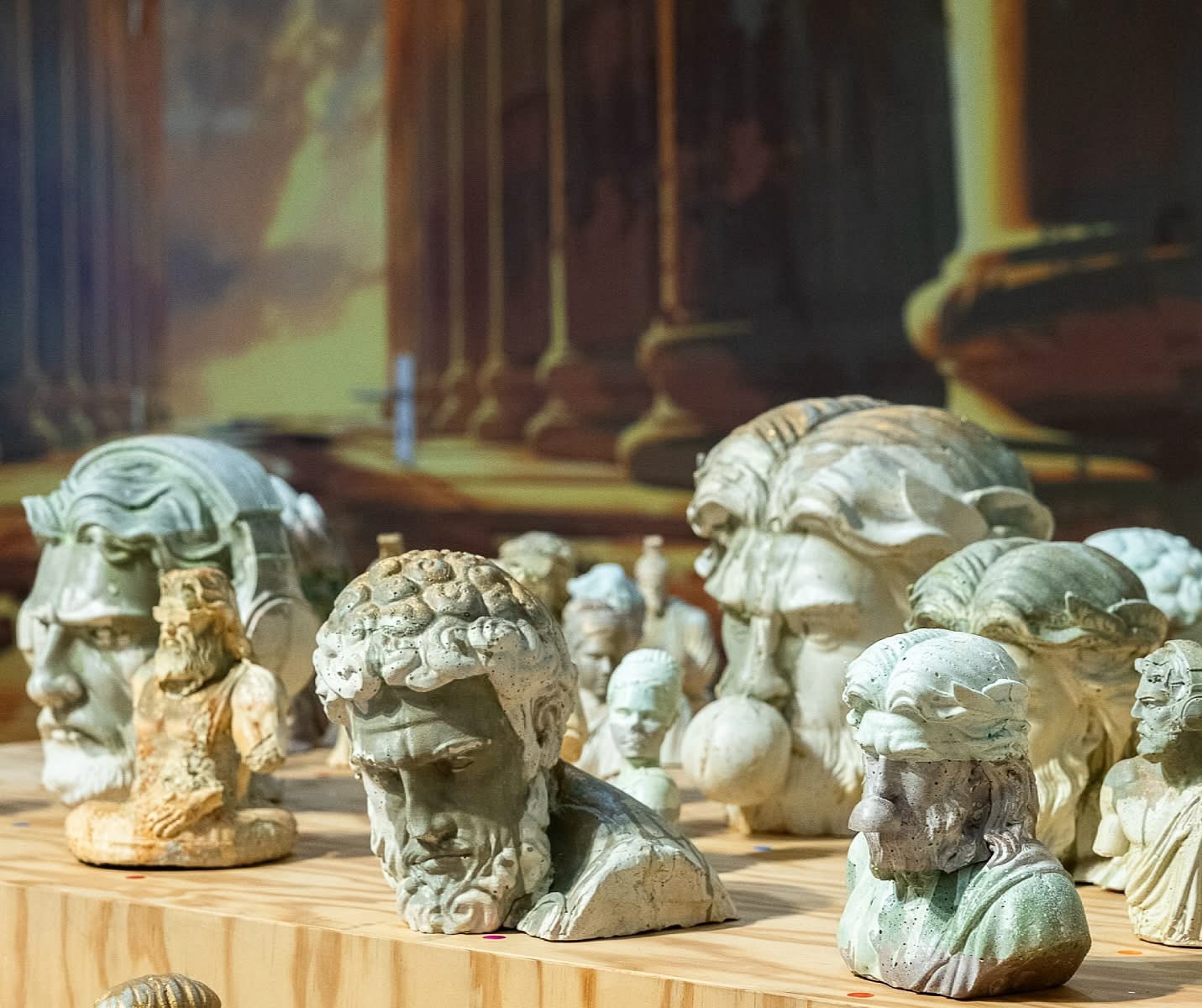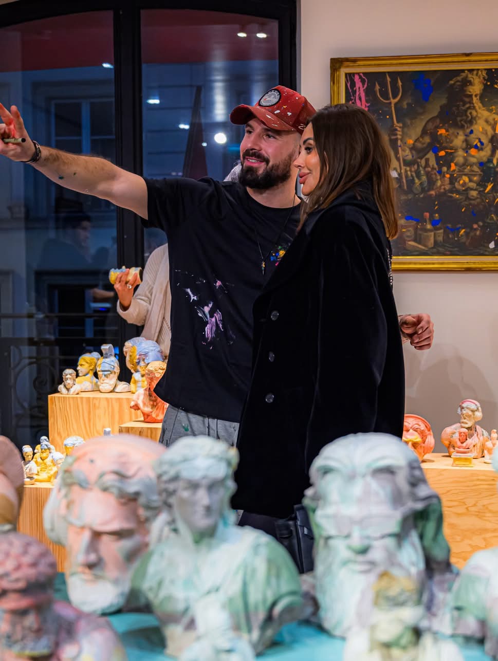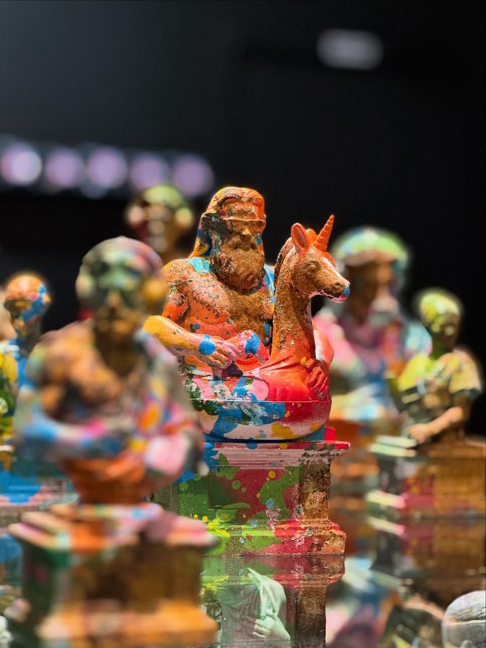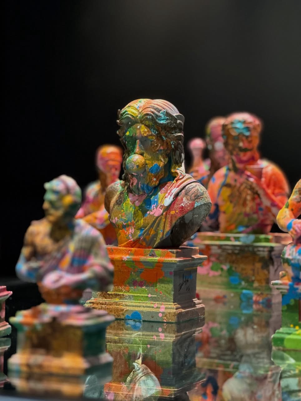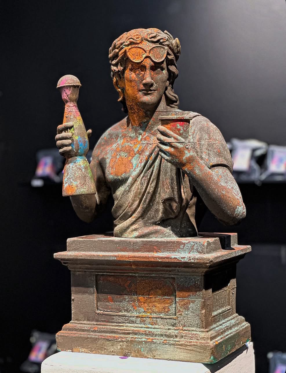 L’exposition n’est pas un simple accrochage : c’est une mise en scène, une atmosphère, un univers. Les colonnes semblent prêtes à se mouvoir, les statues vibrent sous les jeux de lumière, les couleurs explosent comme dans un tableau pop art. On passe d’un espace à l’autre comme dans un clip, un rêve, un décor de cinéma. ZoulliArt joue avec les codes, le sacré devient ludique, l’antique devient pop et le le mythe devient objet de désir.