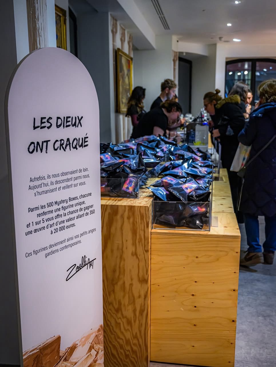Au cœur du dispositif, 500 Mystery Box alignées comme des objets désirables. Chacune renferme une figurine unique, imaginée par ZoulliArt, dont la valeur oscille entre 150 et 20 000 euros. Les niveaux de rareté, beige, argenté, bronze, or, empruntent autant au gaming qu’au luxe. Chaque pièce est équipée d’une puce NFC : authentification instantanée, certificat numérique et la propriété attribuée à l’acquéreur. Un geste simple, un scan et la divinité devient vôtre. C’est la mythologie 3.0, connectée, premium, presque futuriste.