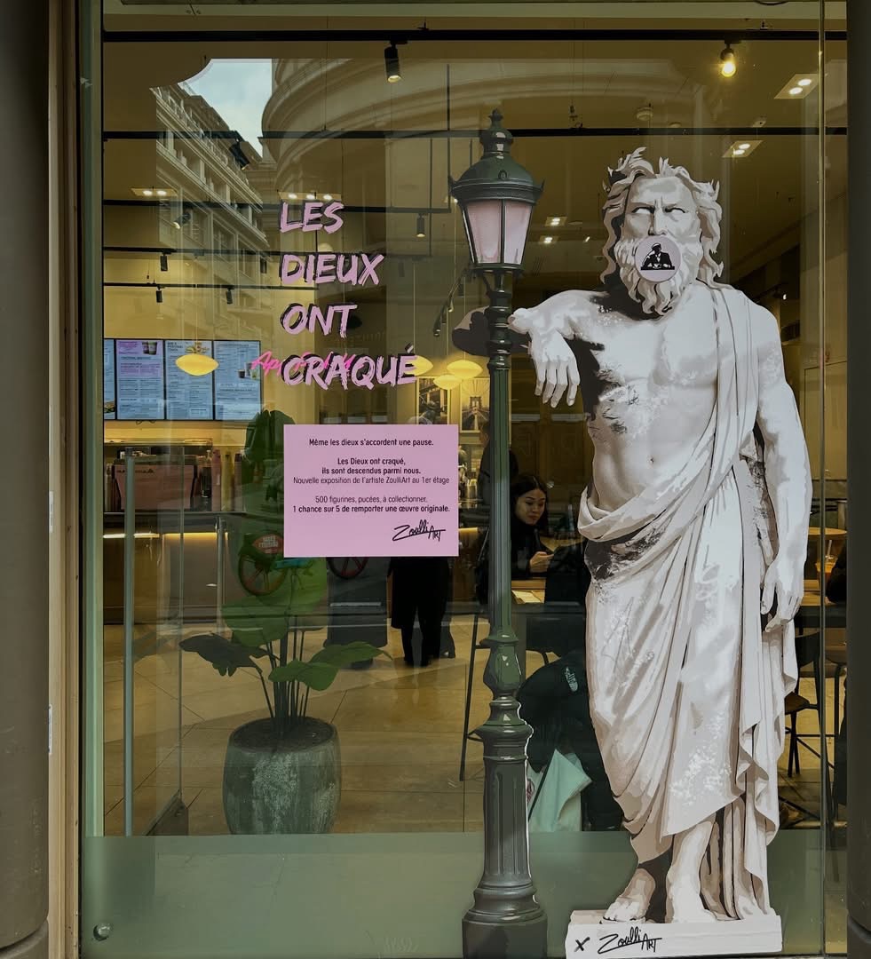 Aux Galeries Lafayette Haussmann, l’Olympe ne se raconte plus : il se vit, il se scanne, il se collectionne. Pendant que Paris défile entre soldes et vitrines scintillantes, un autre spectacle se joue sous la coupole : celui d’un panthéon grec réinventé par ZoulliArt, artiste français qui manie la couleur comme une arme douce et la mythologie comme un terrain de jeu futuriste.