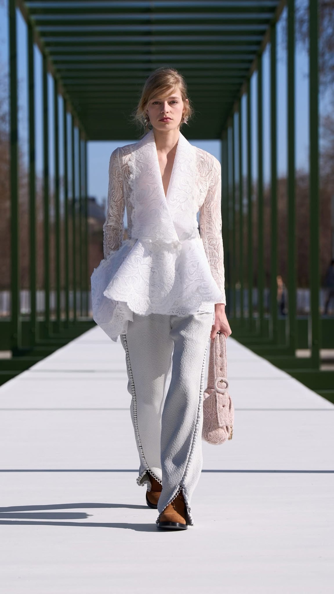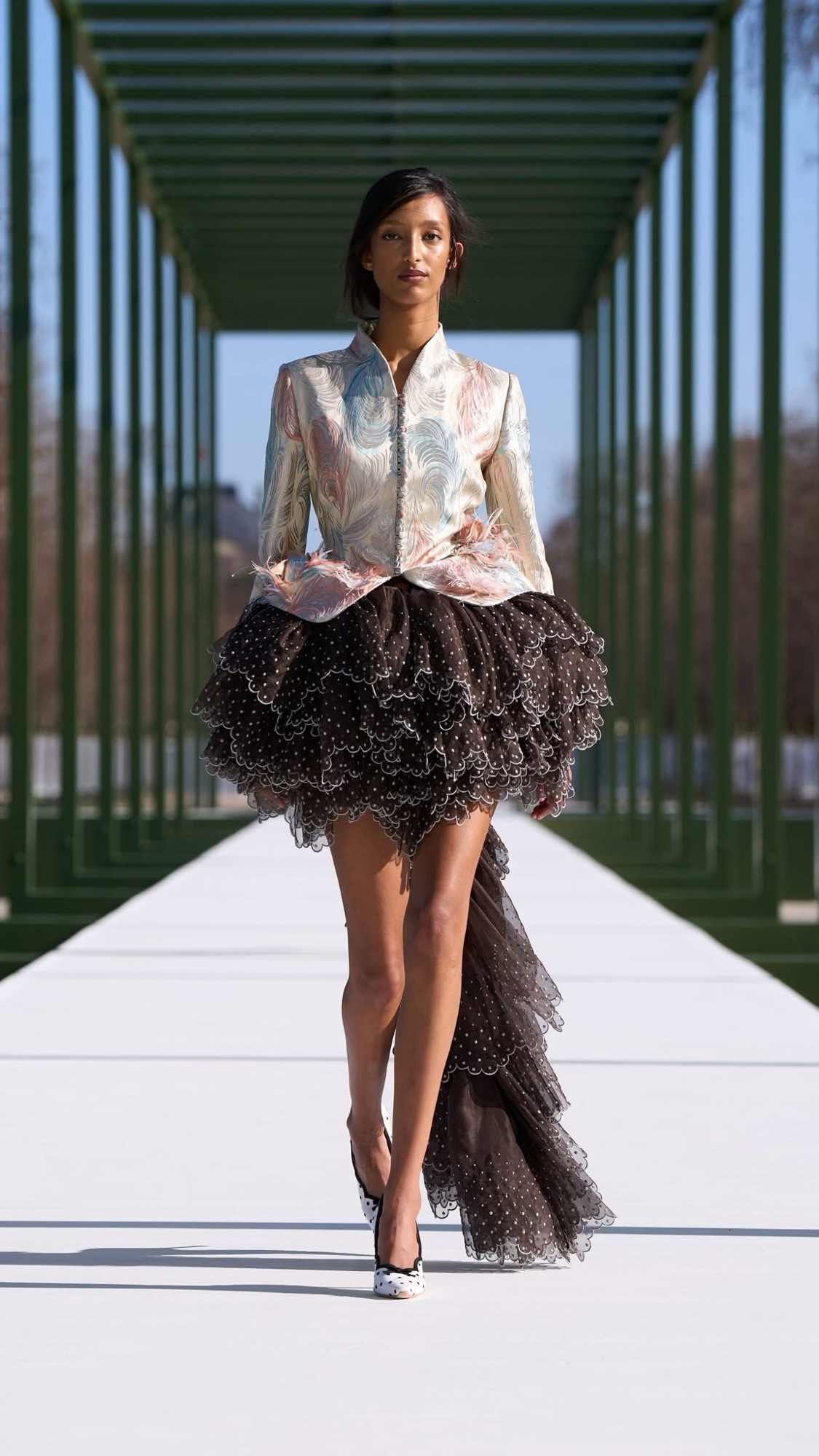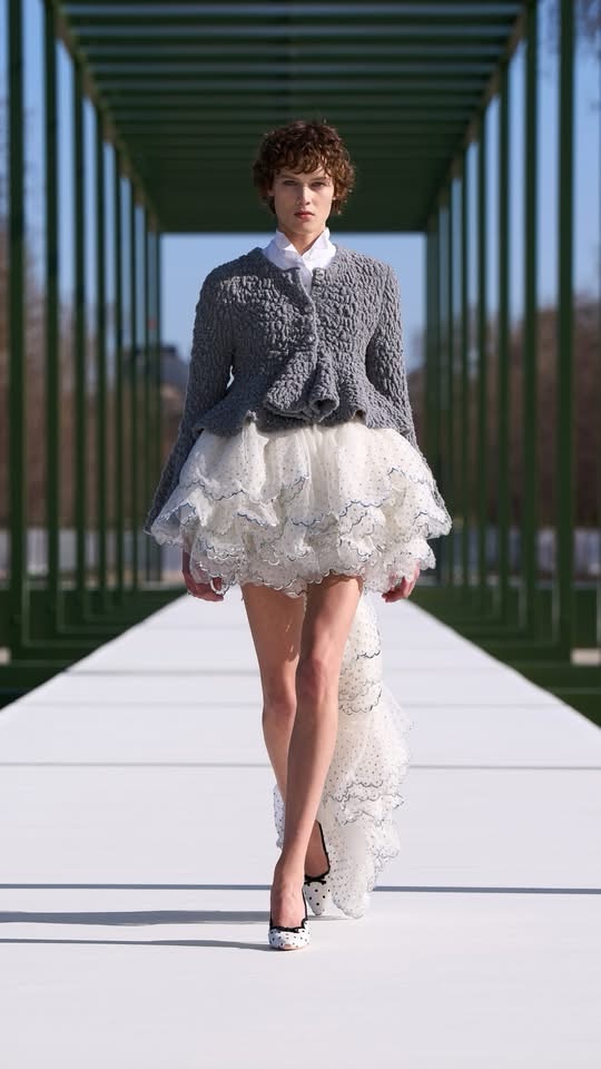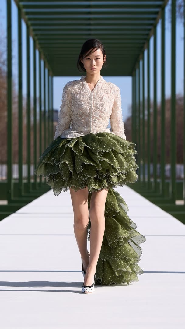 La collection s’ouvrait sur trois tutus à volants, chacun prolongé d’une traîne légère, comme des pétales emportés par le vent. Les chemises péplum, devenues signature d’Anderson chez Dior, redessinaient la taille avec une précision presque botanique. Les robes du soir, en mousseline rose poudré ou blanche, semblaient prêtes à éclore. Elles flottaient autour des corps comme des nénuphars dérivant à la surface d’un étang. Par endroits, des superpositions arrondies au niveau des hanches et du dos évoquaient une silhouette amphibie, subtile, jamais littérale. Une femme-fleur, une femme-grenouille, une femme-eau. Les couleurs glissaient du vert mousse au blanc laiteux, du rose tendre au gris brume. Rien n’était figé. Tout vibrait.