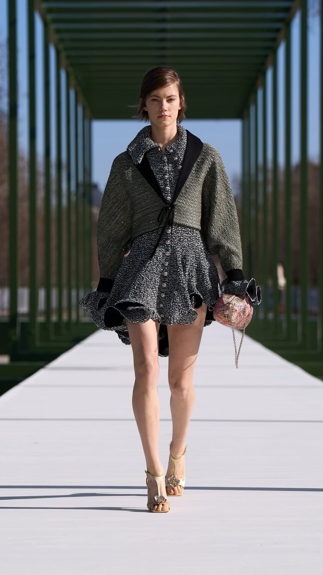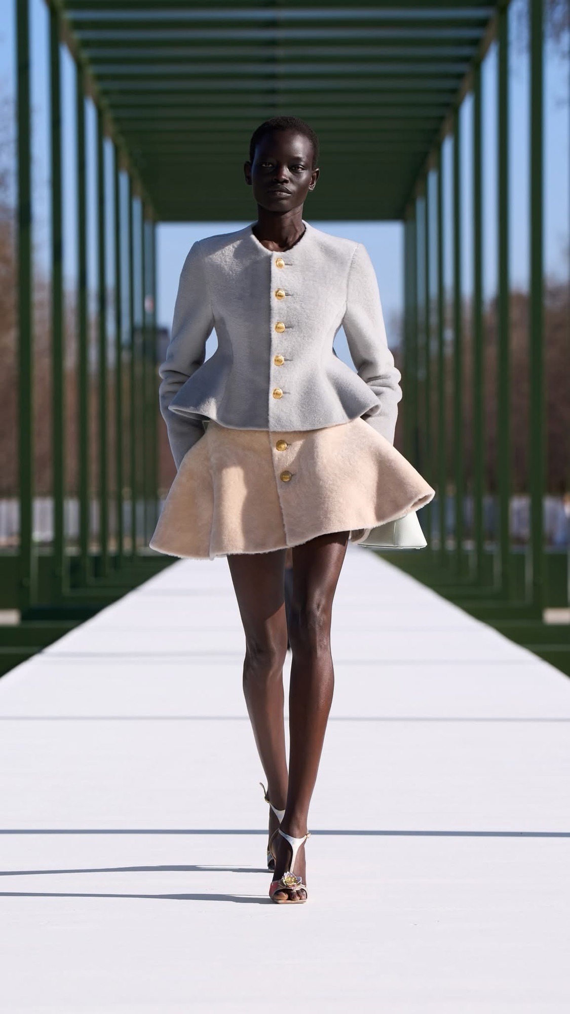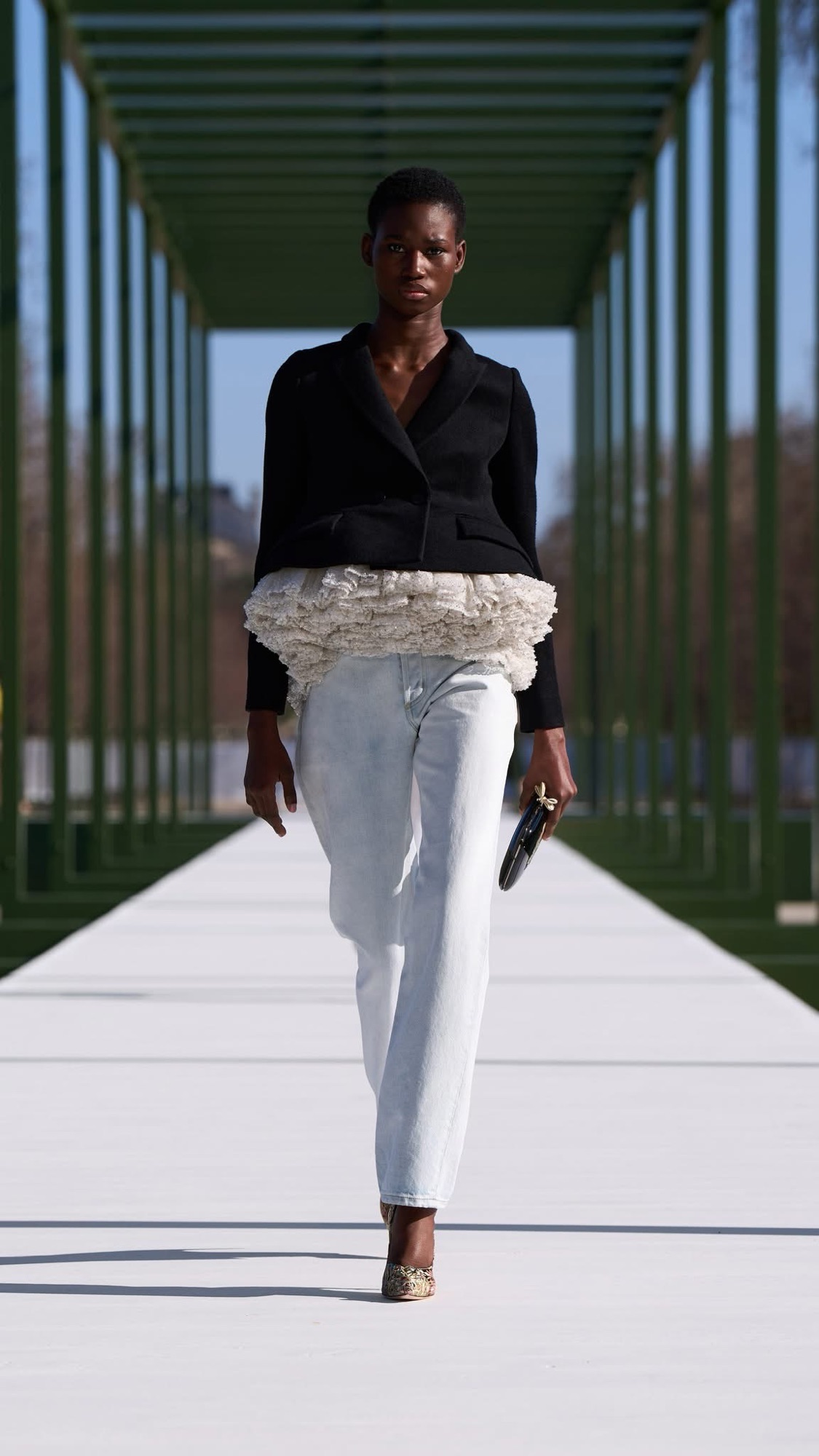La collection s’ouvrait sur trois tutus à volants, chacun prolongé d’une traîne légère, comme des pétales emportés par le vent. Les chemises péplum, devenues signature d’Anderson chez Dior, redessinaient la taille avec une précision presque botanique. Les robes du soir, en mousseline rose poudré ou blanche, semblaient prêtes à éclore. Elles flottaient autour des corps comme des nénuphars dérivant à la surface d’un étang. Par endroits, des superpositions arrondies au niveau des hanches et du dos évoquaient une silhouette amphibie, subtile, jamais littérale. Une femme-fleur, une femme-grenouille, une femme-eau. Les couleurs glissaient du vert mousse au blanc laiteux, du rose tendre au gris brume. Rien n’était figé. Tout vibrait.
