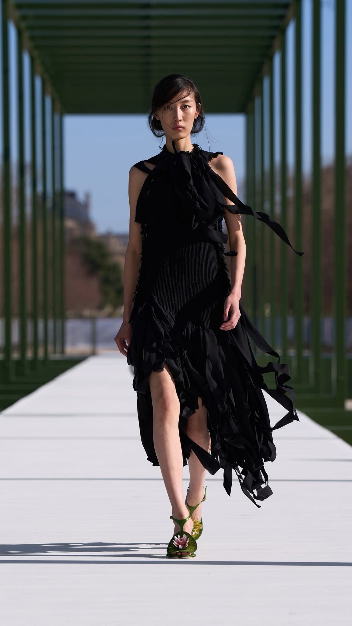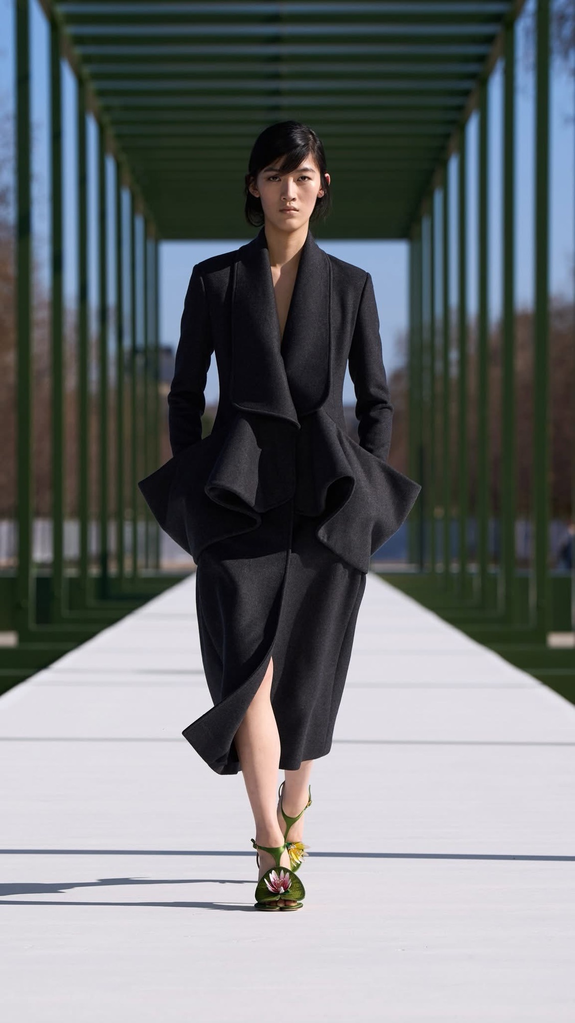 Les chaussures étaient de petits sortilèges : des escarpins vert vif, ornés d’un nénuphar miniature et de sa feuille, comme si une fleur avait décidé de suivre la femme qui la portait. Les tissus se superposaient en couches fines, presque translucides, rappelant les reflets déformés de l’eau. Les volumes, parfois exagérés, semblaient respirer. On aurait dit que les vêtements attendaient le moment exact où la lumière viendrait les toucher.