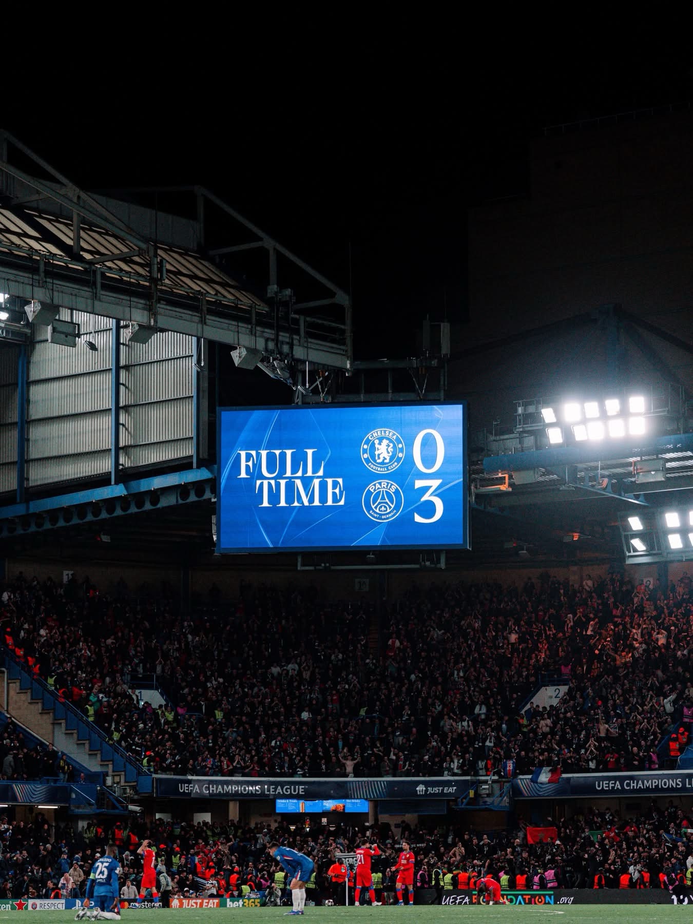 Les Blues tentent de réagir, mais chaque attaque se dissout dans les 30 derniers mètres. Cole Palmer essaye d’enrouler (42ᵉ), Matvey Safonov dit non. Le reste n’est qu’une succession de tentatives molles, de centres sans conviction, de courses sans lendemain. En face, Paris déroule. Marquinhos, Piero Hincapié Pacho, Achraf Hakimi et Nuno Mendes verrouillent. Vitinha, Warren Zaïre‑Emery et João Neves orchestrent. Les supporters parisiens enchaînent les « Olé ». Stamford Bridge se crispe, puis se résigne. Luis Enrique commence à gérer : João Neves sort pour le jeune Senny Mayulu, histoire de le préserver. Liam Rosenior, lui, sort Malang Sarr, déjà au bord du gouffre, pour Kamal Deen Sulemana Acheampong.